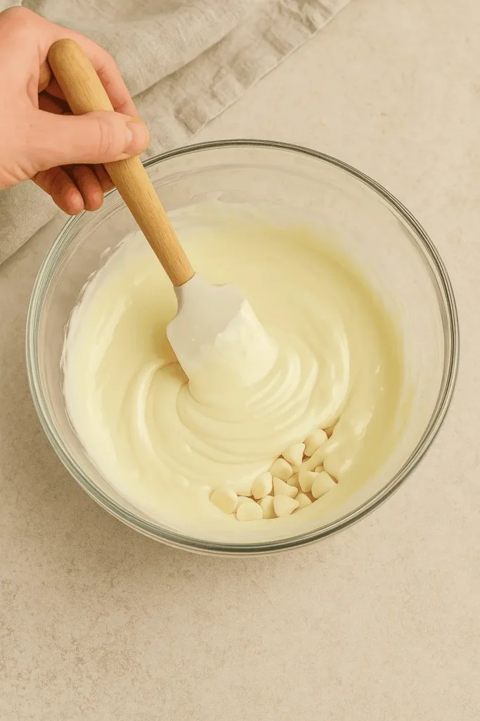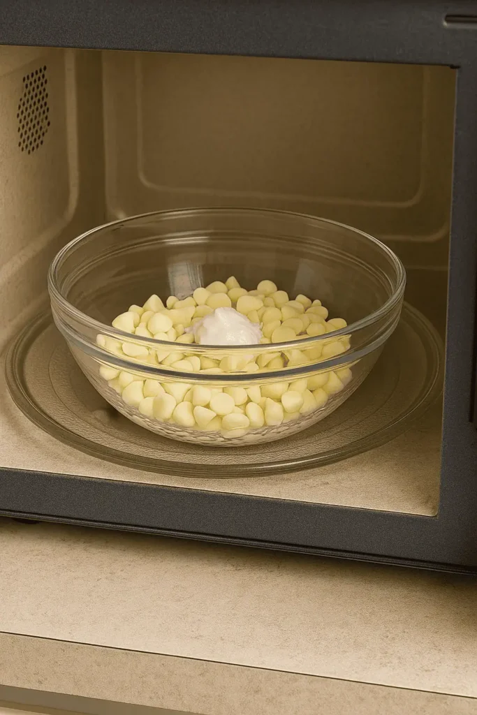 Add the white chocolate chips and coconut oil to a microwave-safe bowl. Heat at 50% power for 2 minutes, stir, then continue in 30-second bursts until smooth. Be patient—slow and steady gives you silky chocolate without burning.