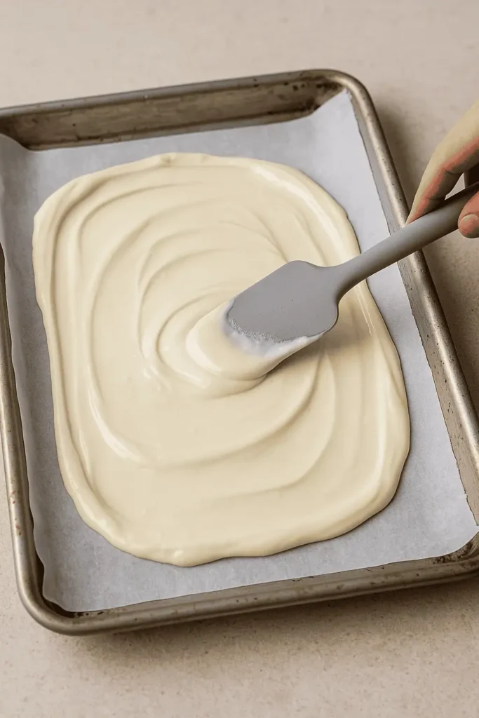 - Line a baking sheet with parchment paper. Spread the melted chocolate evenly over the sheet.