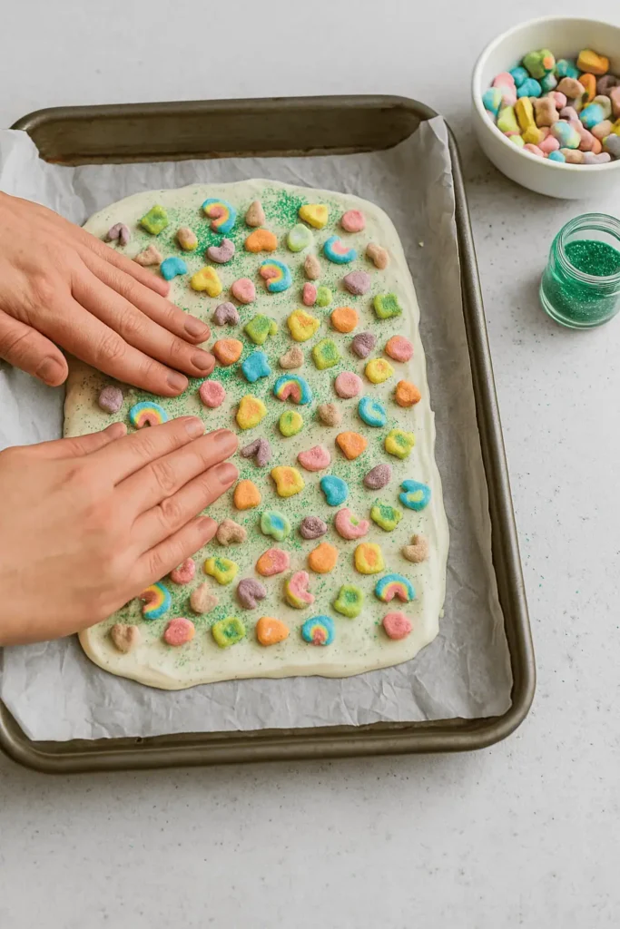 Sprinkle Lucky Charms cereal over the chocolate. Gently press it down so it sticks. Then shower it with glitter or festive sprinkles for that magical touch.