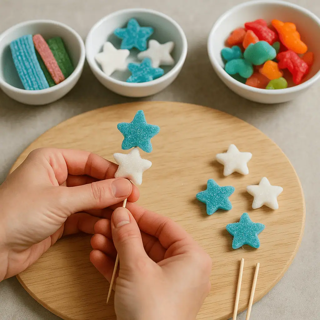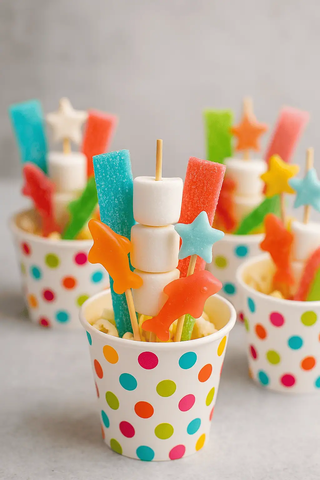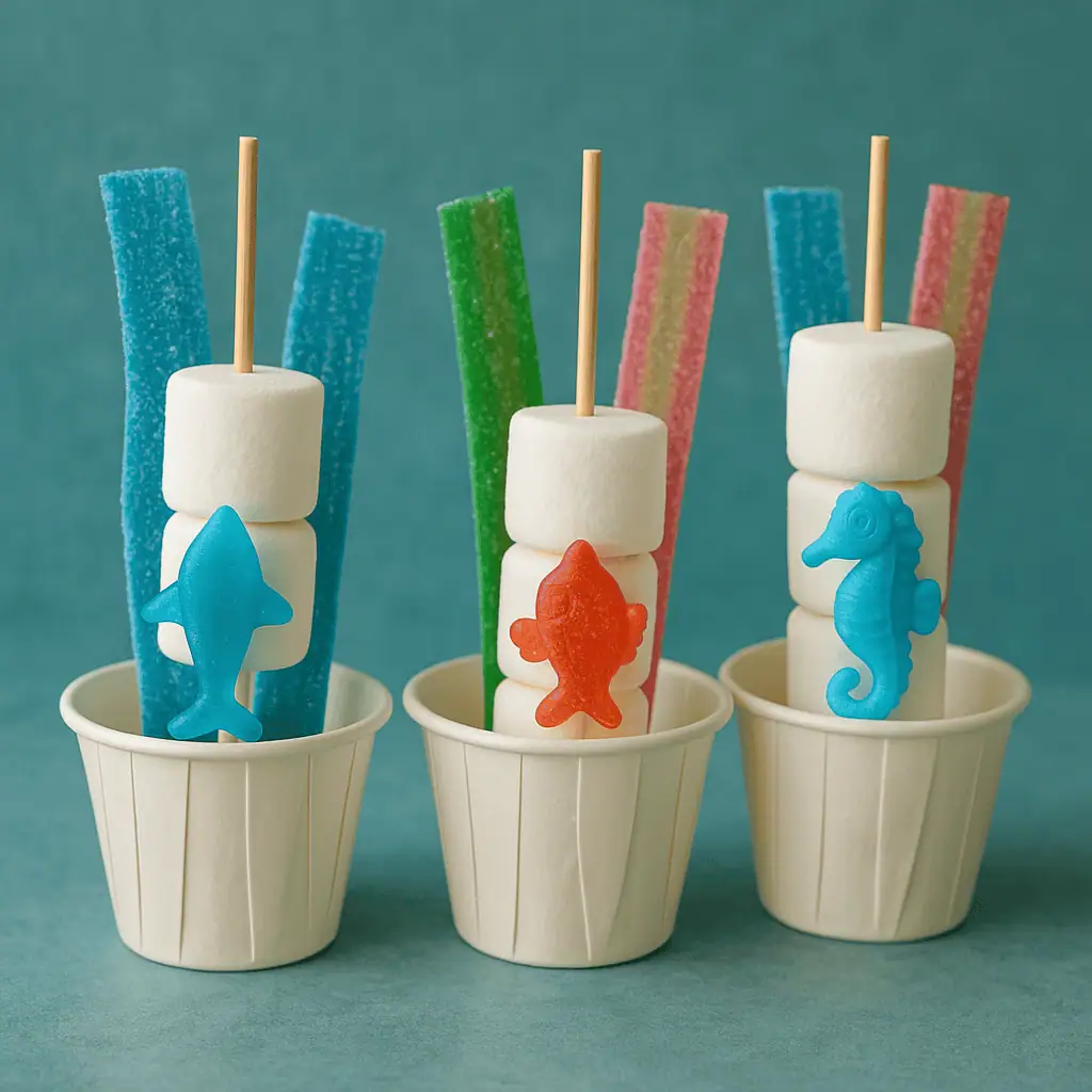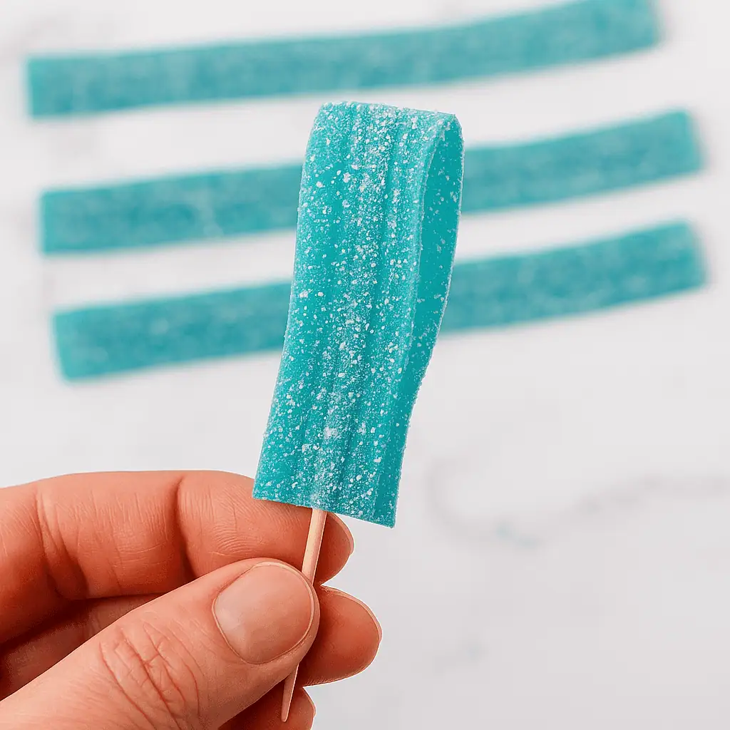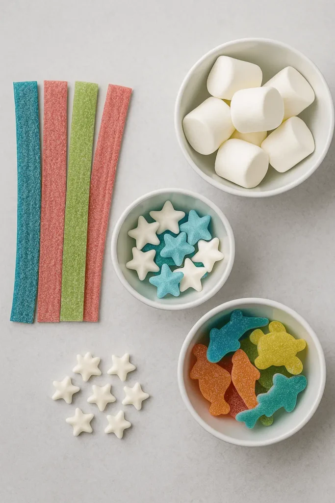 Prepare extra picks with green and pink sour strips. These will act like coral or seaweed, adding a pop of color to your ocean scene.