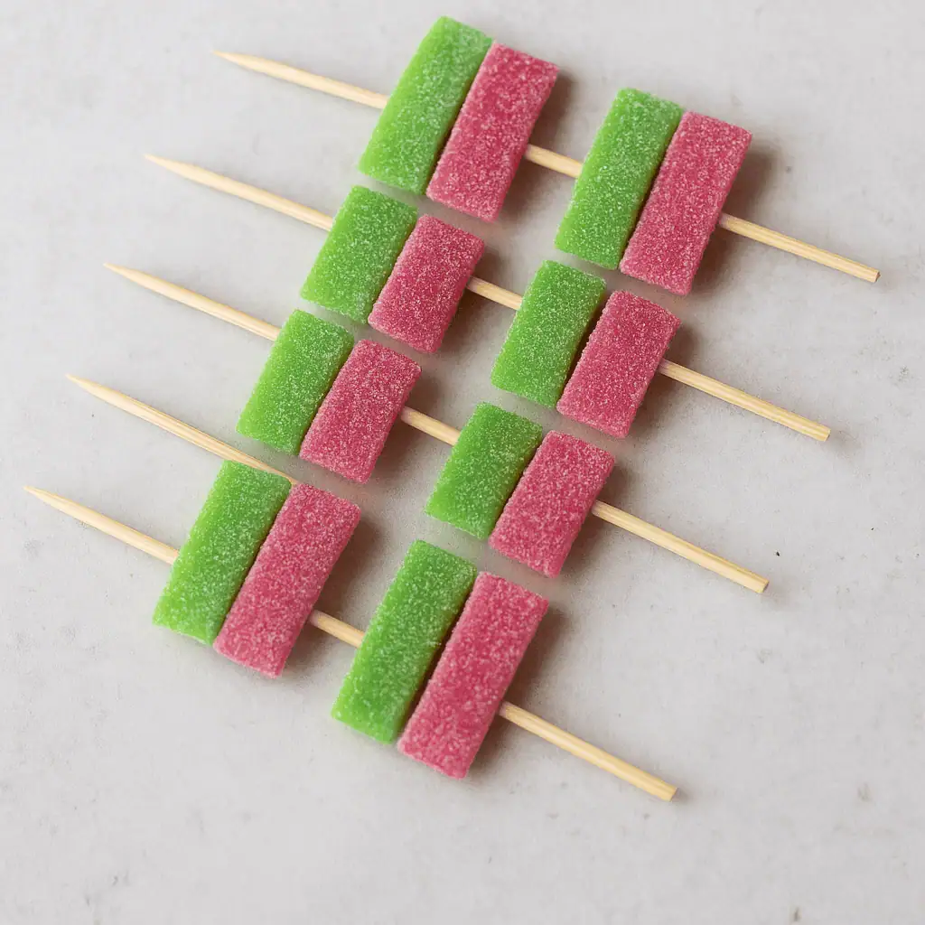 - Thread a blue sour strip on a bamboo pick for each cup.