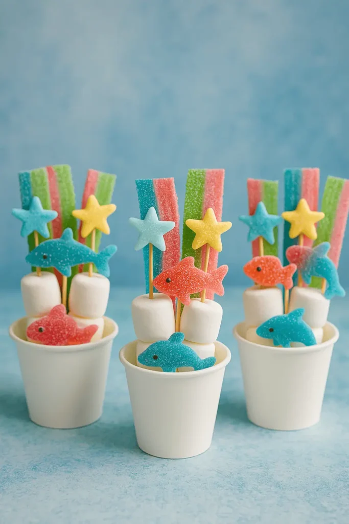 Skewer two star-shaped gummies onto a pick for each cup. These will sparkle like sea stars in your ocean display.