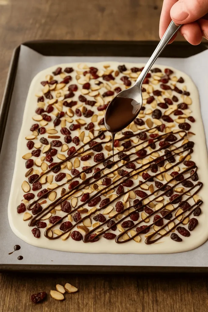 Before it sets, scatter toasted almonds and dried cranberries over the top. Press gently so they stick.